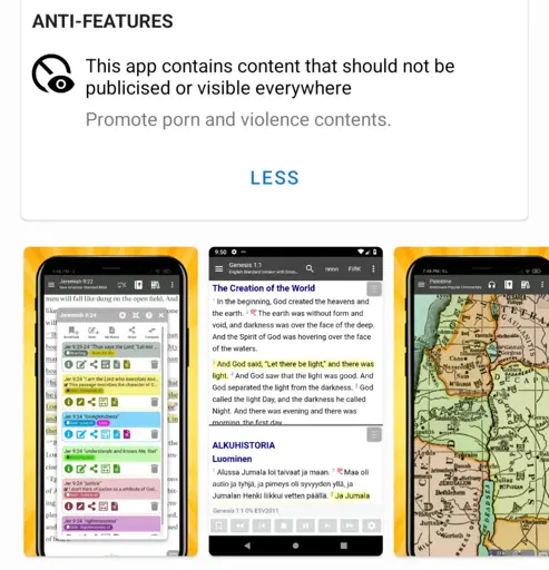 Flax@feddit.ukMEnglish · 5 months agoF-Droid has appeared to have been labelling Bible Apps as "Not safe for work"plus-squarefeddit.ukimagemessage-square0linkfedilinkarrow-up11