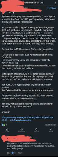 At this point, choosing C/C++ for safety‑critical paths, or dynamic languages for the core of a large system, isn’t just “old school.” It’s negligence with better marketing.