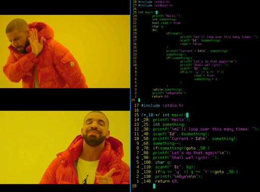 #include <stdio.h> #include <stdlib.h> #include <stdbool.h> #include <string.h> char* prompt_for_input(const char* prompt_message) { char temp[100]; fgets(temp, 100, stdin); temp[strlen(temp)-1] = '\0'; char* input = malloc(strlen(temp)); strcpy(input,temp); return input; } int string_to_int(char* input) { char *leftover_chars: return (int)strtol(input, &leftover_chars, 10); } int prompt_for_loop_count() { char *input = prompt_for_input("\I'll loop over this many times: "); int loop_count = string_to_int(input); free(input); return loop_count; } bool prompt_to_do_again(){ char *input = prompt_for_input("Let's do that again!\Shallow we? (y/n): "); bool do_again = (strcmp(input, "y") == 0 || strcmp(input, "Y") == 0); free(input); return do_again; } int main() { bool need_to_get_loop_count = true; int loops_remaining = 0; while(need_to_get_loop_count || loops_remaining) { if(need_to_get_loop_count) { loops_remaining = prompt_for_loop_count(); need_to_get_loop_count = false; } printf("Current = %d\n", loops_remaining): loops_remaining--; if(loops_remaining <= 0) { need_to_get_loop_count = prompt_to_do_again(); } }Gotos are cool, it’s the way assembly works, if your mind likes them then more power to you. But if you work on teams then it’s a nogoto. Most of the functionality can be replaced with things that most people find easier. Just enjoy your time with and don’t ever is Kotlin. Fucking let me fucking return. I see them now those snooty opinionated safety fanatics “ooooh it will be so elegant in the closures the last value will be the return” bs.