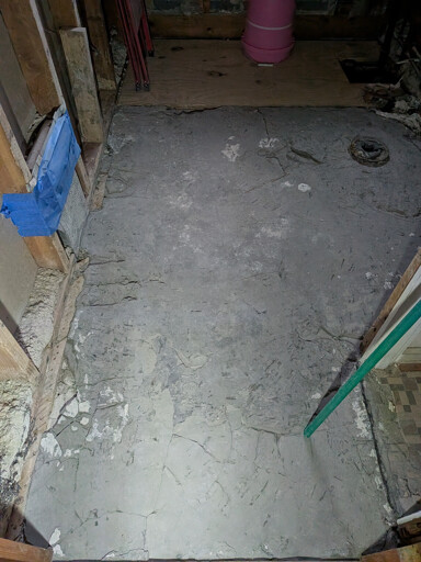 I’m currently working on renovating the bathroom in our 1958 home. I just finished tearing out the shoddy job some flippers did a few years back, and found some issues with the floor that have got me scratching my head. I’ve learned that it was common practice back in the 50’s to have a mortar slab subfloor, and it looks like that’s what I have in our bathroom (except where the old bathtub was, where there was just 2 layers of 5/8" plywood). The tile was adhered directly to the slab with no decoupling membrane, and the only way I could get it and the thinset off was with a rotary hammer. I’m afraid that might have been too aggressive though, because now there’s a bunch of cracks in the subfloor. I’m not certain if the cracks go all the way through because the bottom/sides of the slab are hidden. But I’m also not certain the actual original mortar slab is cracked, or if the flippers put a super thick layer or two of leveling compound down, and that’s what’s cracked, because in one area where I accidentally made a deeper gouge, it looks like there’s about an inch of smooth grey mortar-like substance at the surface, but beneath that is a lighter-colored concrete-like substance with an aggregate mixed into it.