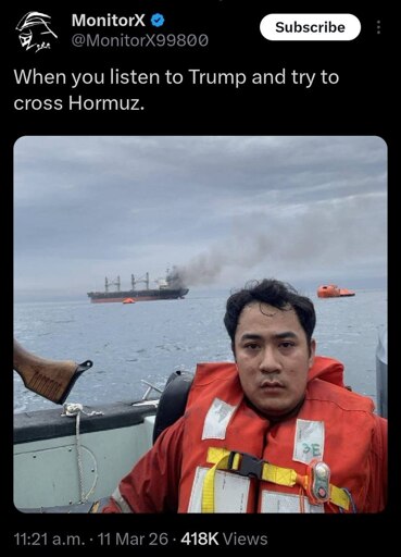 ☆ Yσɠƚԋσʂ ☆@lemmy.ml to Share Funny Videos, Images, Memes, Quotes and more @lemmy.mlEnglish · 9 days agoWhen you listen to Trump and try to cross Hormuzlemmy.mlimagemessage-square0linkfedilinkarrow-up12