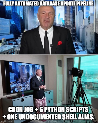 minus-squareDickFiasco@sh.itjust.workslinkfedilinkarrow-up0·1 month agoAny problem in server administration can be solved with an additional crontab entry. Except for the problem of too many crontab entries.
