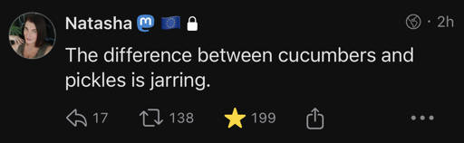 cannedtuna@lemmy.world to Dad Jokes@lemmy.worldEnglish · 29 days agoComing up with good titles is cumbersome. I just can’t dill with it.lemmy.worldimagemessage-square6linkfedilinkarrow-up1431