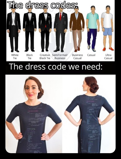 minus-squareNannerBanner@literature.cafelinkfedilinkarrow-up0·29 days agoI’m so confused. Business casual has always meant nice pants, button down shirt, but no tie or overcoat where I’ve been. I’ve also never seen the distinction between ultra casual and casual… maybe ‘work casual’ compared to ‘casual.’