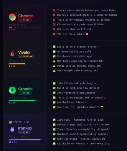 🔴 Chrome — tracks everything. Avoid. 🟡 Vivaldi — better, but not fully open 🟢 Cromite — FOSS, de-Googled Chrome 🦊 IronFox — the privacy king. My daily.