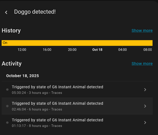 early_riser@lemmy.world to homeassistant@lemmy.worldEnglish · 16 days agoI made my Unifi camera excitedly scream 'Doggo!' every time it detects an animal. I did not account for the several minute delay for image processing and the fact we have stray cats.lemmy.worldimagemessage-square10linkfedilinkarrow-up11arrow-down10file-text