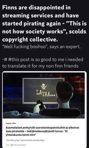 lanigerous@feddit.uk to Piracy: ꜱᴀɪʟ ᴛʜᴇ ʜɪɢʜ ꜱᴇᴀꜱ@lemmy.dbzer0.comEnglish · edit-220 days agoGood old Finland (subtitle is commentary, not in text)lemmy.blahaj.zoneimagemessage-square33linkfedilinkarrow-up11arrow-down10file-text