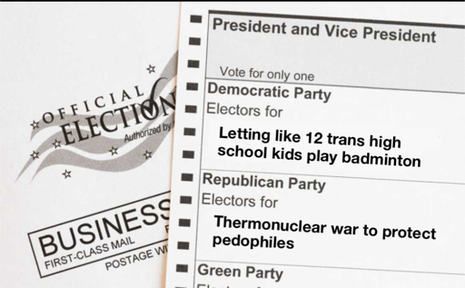 minus-squarebecausechemistry@piefed.sociallinkfedilinkEnglisharrow-up0·4 days agoGreen Party: distract mostly left-leaning people to make it easier for Republicans to get elected