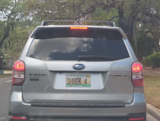 A landscape photo of the back of a silver Subaru Forester driving down a canopied road. The Florida license plate reads “SHREK 4”