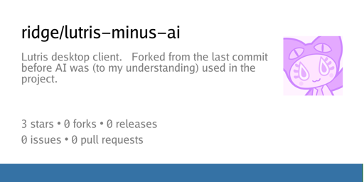 Twig@sopuli.xyz to Linux Gaming@lemmy.worldEnglish · 5 days agolutris-minus-aicodeberg.orgexternal-linkmessage-square23linkfedilinkarrow-up11cross-posted to: linux_gaming@lemmy.ml