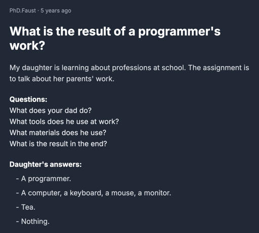 ☆ Yσɠƚԋσʂ ☆@lemmy.ml to Programmer Humor@lemmy.mlEnglish · 28 days agoWhat is the result of a programmer's work?lemmy.mlimagemessage-square3linkfedilinkarrow-up11arrow-down10cross-posted to: programmer_humor@programming.dev