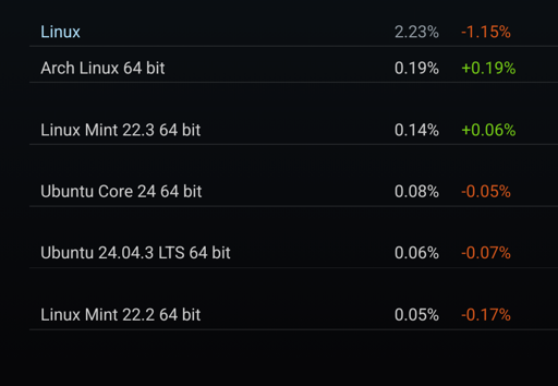 It’s currently at 8.27% on the gamingonlinux tracker: https://www.gamingonlinux.com/steam-tracker/